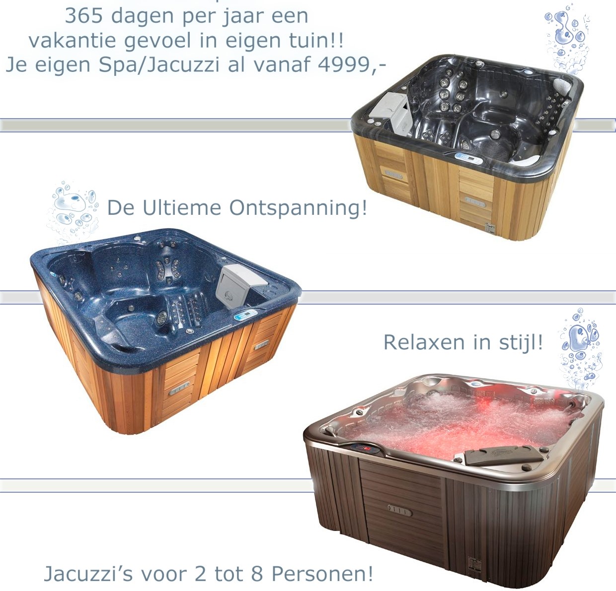 We kunnen de beste spa-Jacuzzi’s leveren in elk budget. We leveren tegen de scherpste prijzen, ook leveren we luxe hout gestookte jacuzzi’s voor € 4.950,- inclusief bezorging en installatie.